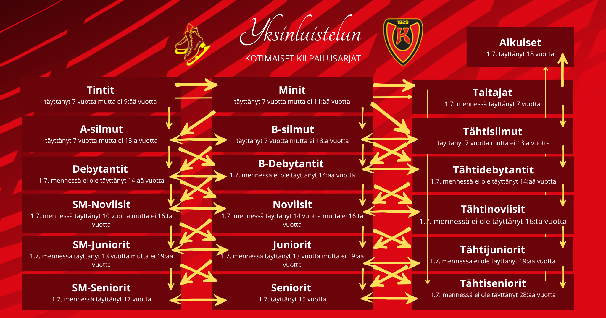 Kooveen luistelijat kilpailevat sarjansa mukaan joko kutsukilpailuissa tai valintakilpailuissa / loppukilpailuissa. Luistelijan kilpailusarja määrittyy luistelijan iän ja taitotason mukaan. Kilpailusarjoissa on voimassa Suomen Taitoluisteluliiton testijärjestelmä ja kilpailusarjaan kuuluvien testien läpäiseminen on edellytys kussakin sarjassa kilpailemiseen.
